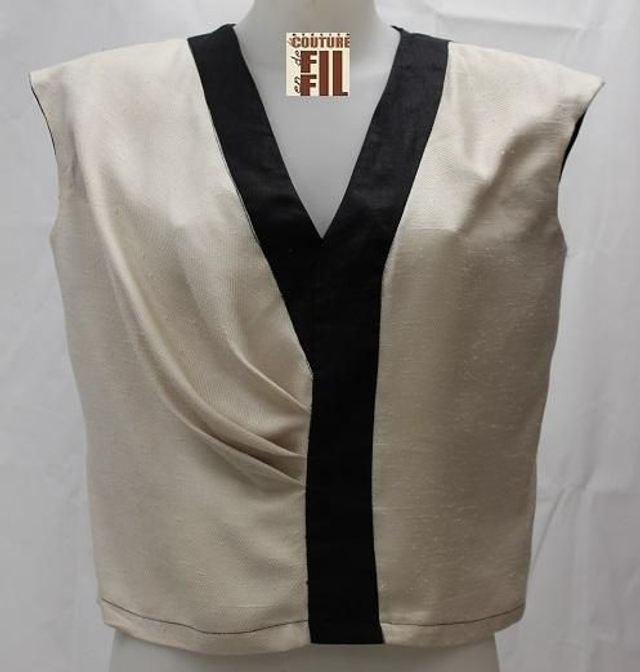 top écru et noir devant avec un drapée sur un coté dos noir uni